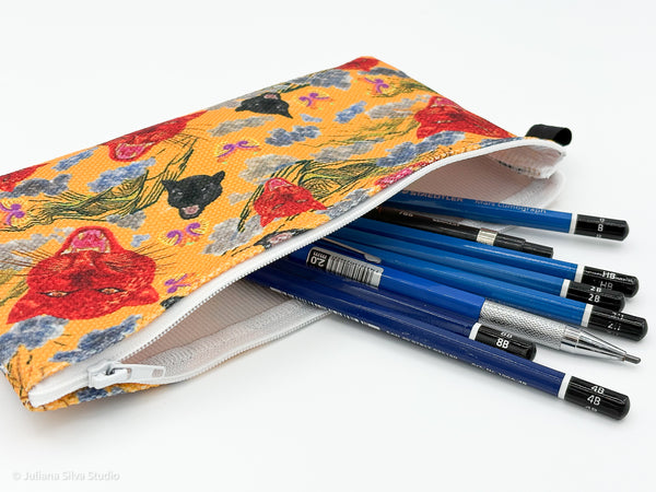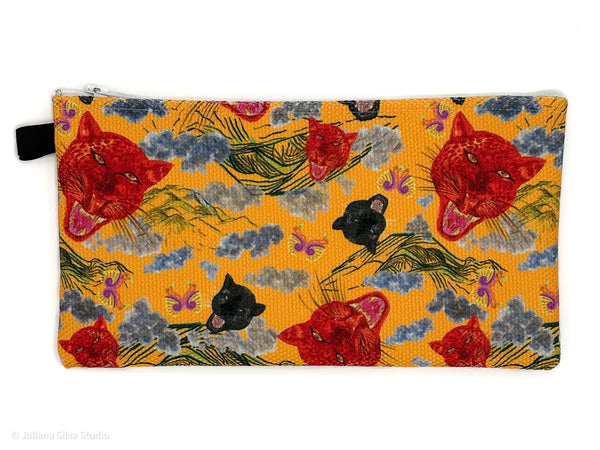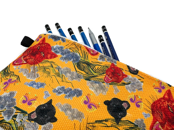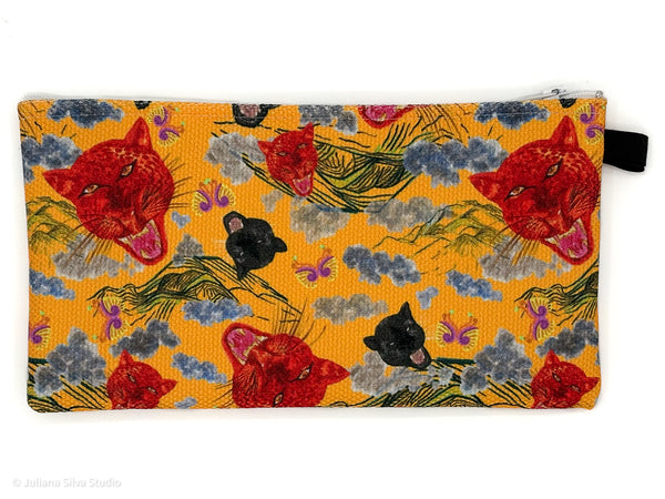 The Volcanos’s Roar Yellow pencil case crafted from durable canvas with a reliable white YKK zipper and convenient side loop, this pencil case combines functionality with artistic distinction. Beyond organizing art supplies, it adapts seamlessly to storing documents, cosmetics, or personal accessories. The design features striking imagery from Juliana Silva's "Dance Forms in the Street" collection, inspired by Colombia's Black and Whites Carnival traditions. Symbolic panther motifs reference the volcanic power of Pasto's legendary volcano, while the intricate patterns capture the vibrant energy of regional carnival celebrations. A thoughtfully designed piece that merges practical utility with culturally rooted artistic expression.
