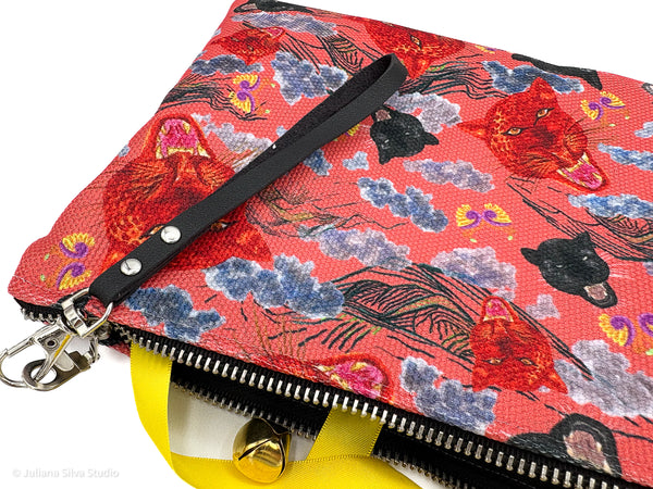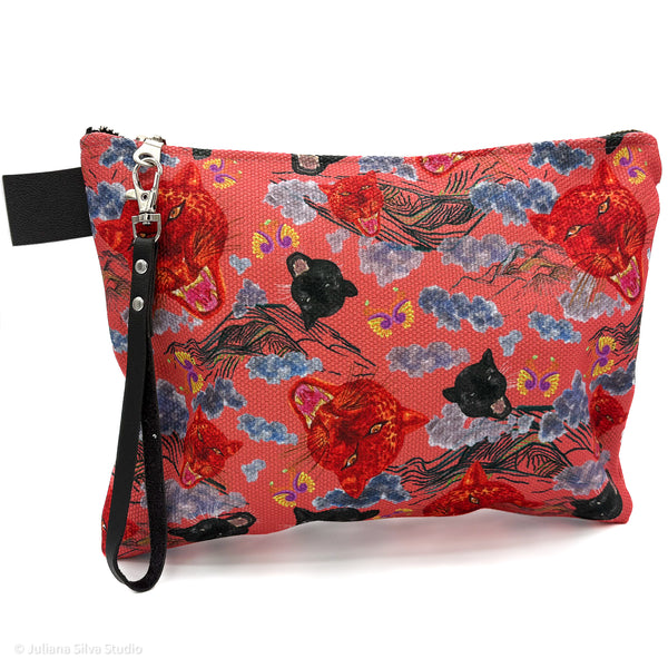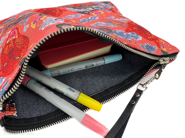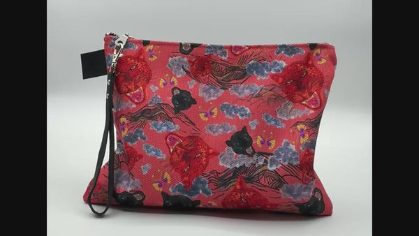 Crafted from premium canvas with a durable denim interior, the Volcano's Roar carry-all bag beautifully combines functionality with artistic storytelling. It features a reinforced metal zipper and a refined vegan leather pull for lasting durability, while the side grip tab enhances both accessibility and visual appeal. This versatile bag can effortlessly transition between roles—serving as an elegant clutch, a practical cosmetic organizer, or a document holder.